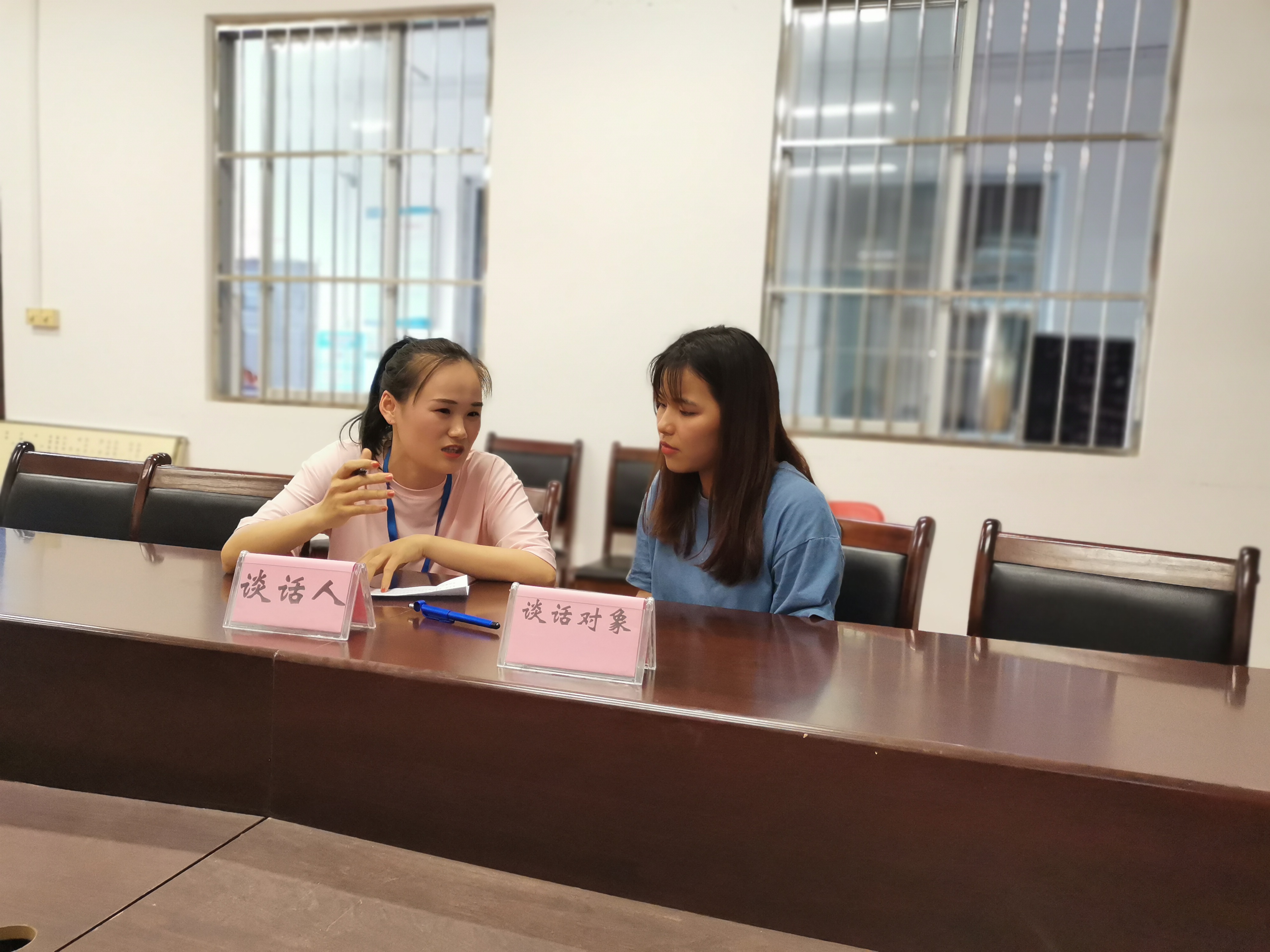 在第二部分面對面談話測試中,由學(xué)校副書記、副校長胡細(xì)木、學(xué)生工作處負(fù)責(zé)人、土木工程學(xué)院負(fù)責(zé)人、以及學(xué)生管理工作經(jīng)驗(yàn)豐富的學(xué)工處老師、藝術(shù)設(shè)計(jì)學(xué)院負(fù)責(zé)人組成評(píng)委小組。為了大賽公平公正,賽前提前十分鐘抽題,安排一名學(xué)生作為談話對象,情景再現(xiàn)進(jìn)行面對面談話。