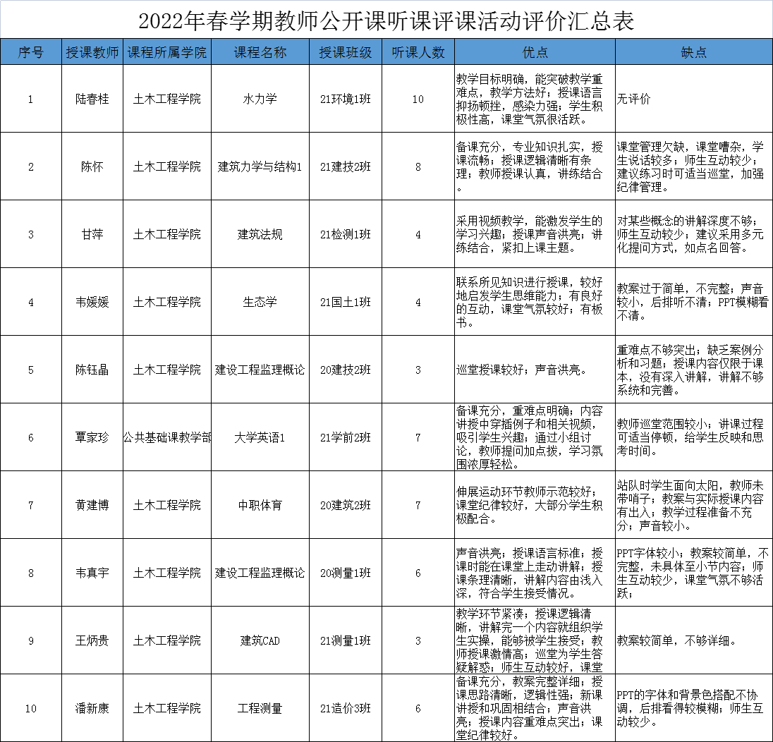 為促進(jìn)我院教師在崗業(yè)務(wù)培訓(xùn)工作的順利進(jìn)行,同時(shí)也為了進(jìn)一步檢驗(yàn)教師的教學(xué)水平,土木工程學(xué)院根據(jù)學(xué)院教務(wù)處、教學(xué)督導(dǎo)室下發(fā)的《廣西工程職業(yè)學(xué)院關(guān)于開展2022年春學(xué)期教師聽課評(píng)課活動(dòng)的通知》等文件要求,于2022年4月18日—4月29日積極組織配合教學(xué)督導(dǎo)室開展了本學(xué)期的公開課活動(dòng)?;顒?dòng)過程中,授課教師都能做到課前認(rèn)真?zhèn)湔n、課上認(rèn)真教學(xué),聽課教師也能認(rèn)真聽課,并認(rèn)真填寫了聽課評(píng)課記錄表。