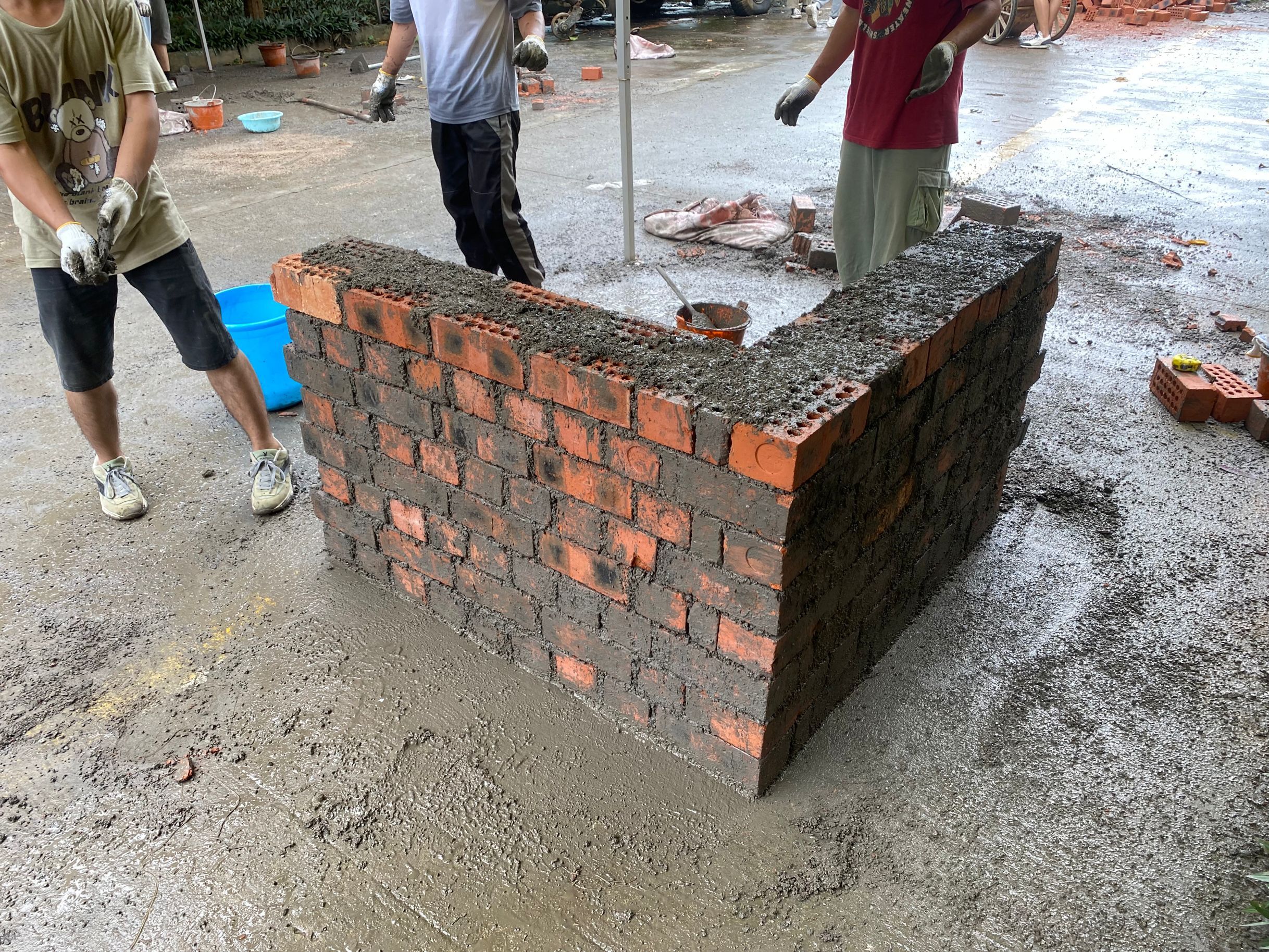 本次比賽要求選手們在85分鐘內(nèi)完成長約2~3m、高約0.9~1.2m墻體砌筑工作,砌筑要求為:墻厚240mm,轉(zhuǎn)角設(shè)構(gòu)造柱邊留馬牙槎,設(shè)拉結(jié)筋。競賽中,參賽隊伍充分發(fā)揚精益求精、一絲不茍的工匠精神,利用兩兩配合、分工協(xié)作的方式,一個負(fù)責(zé)砌筑磚塊,一個負(fù)責(zé)幫忙輔助放線、擺磚、砌墻、和泥漿、切磚等工序在選手們熟練的操作下,進(jìn)行的有條不紊。選手們賽出了風(fēng)格、賽出了水平。