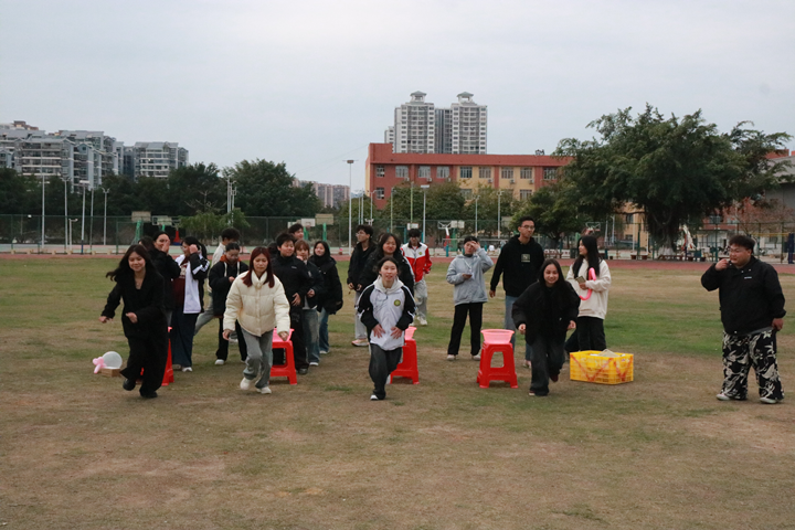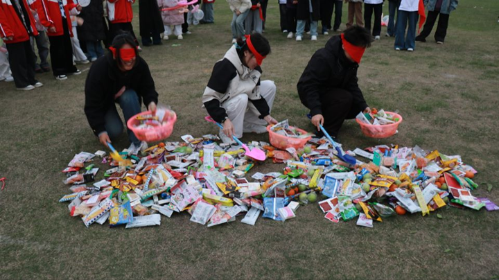 “比比誰的速度快”環(huán)節(jié)。限定距離跑到放置零食的位置在5秒時間內(nèi)兩手抓取零食。同學們紛紛向前奔跑,收獲滿滿。