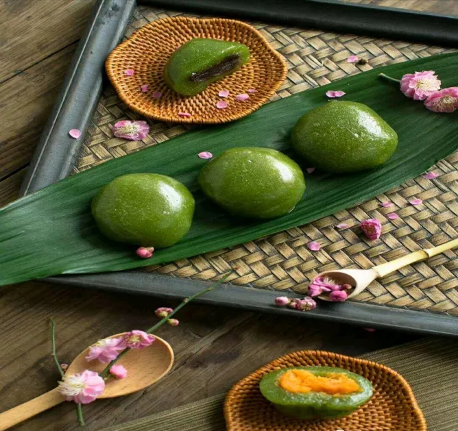 壯鄉(xiāng)三月三來臨之際家家戶戶都會提前準備好紅蘭草花、紅楓葉、紫番藤、黃飯花浸泡制成紅、黃、黑、紫、白五色糯米,五色糯米不僅象征著五谷豐登、幸福吉祥,還有具有驅寒避邪的功效。除了好吃的五色糯米飯還有清香美味的艾草青團,它是由精選新鮮艾草制作而成,吃青團不僅是為了懷念祖先、紀念先人