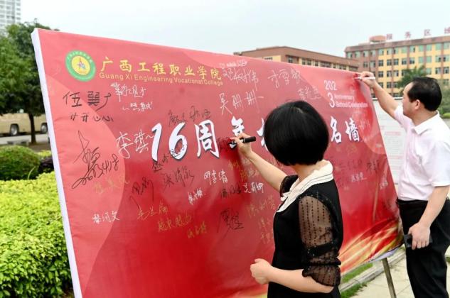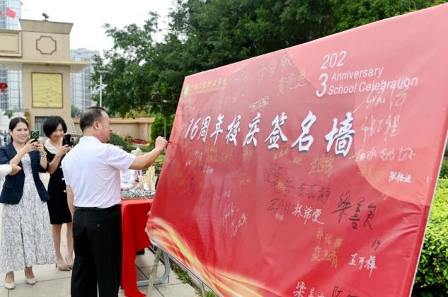 領(lǐng)導(dǎo)、嘉賓、校友及師生分別在學(xué)校16周年校慶簽名墻上簽名