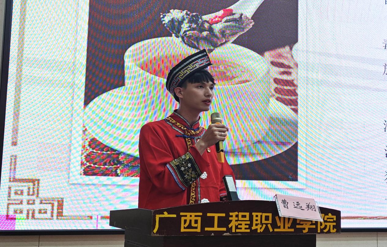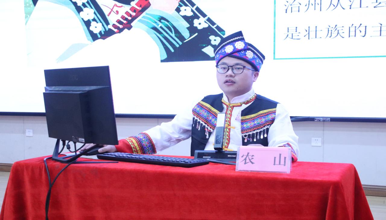 教育學(xué)院黨支部宣傳委員農(nóng)山同志,他以壯族山歌文化和銅鼓藝術(shù)為主線,展現(xiàn)了壯鄉(xiāng)的錦繡山河與團(tuán)結(jié)精神。“壯族山歌傳唱千年,唱的是對(duì)美好生活的向往,更是民族團(tuán)結(jié)的深情。”