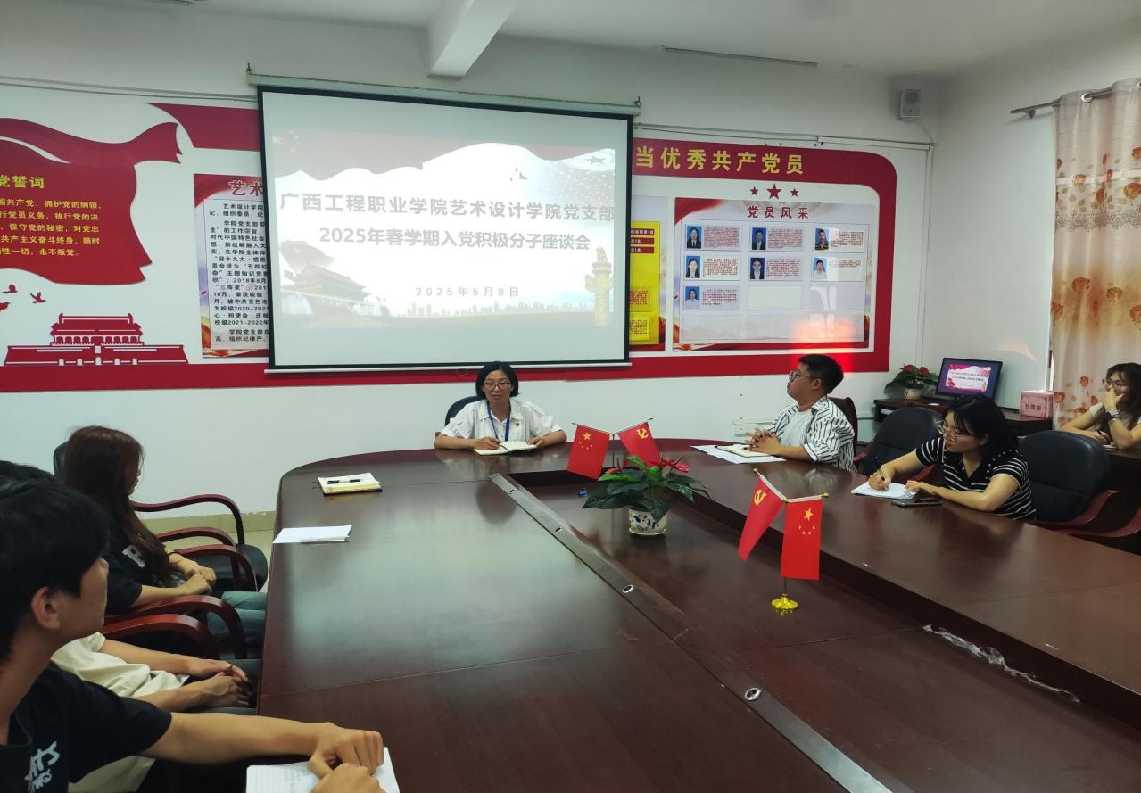 2025年5月8日下午,藝術(shù)設(shè)計(jì)學(xué)院黨支部在學(xué)院三樓黨員活動(dòng)室召開(kāi)2025年春學(xué)期入黨積極分子座談會(huì)。學(xué)院黨支部書記覃鳳姣、副書記趙志輝、宣傳兼統(tǒng)戰(zhàn)委員曹遠(yuǎn)翔老師出席本次座談會(huì),與入黨積極分子展開(kāi)交流。此次座談會(huì)旨在進(jìn)一步加強(qiáng)入黨積極分子的培養(yǎng)教育,引導(dǎo)青年學(xué)子堅(jiān)定理想信念、勇?lián)鷷r(shí)代使命。