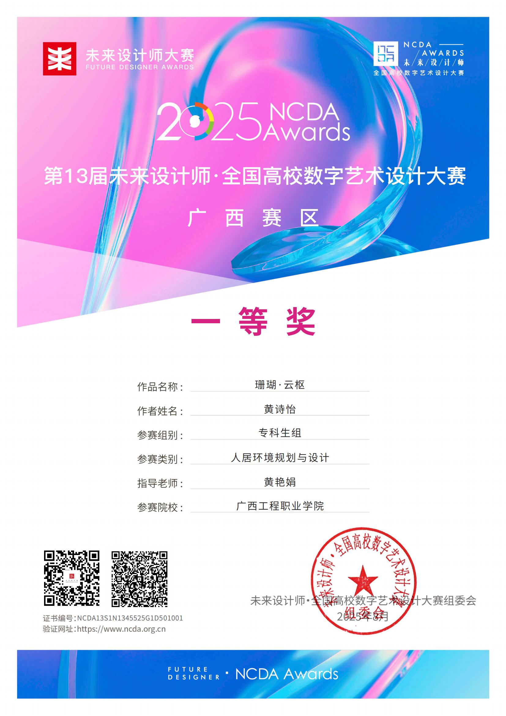 近日,2025年第13屆未來設(shè)計師·全國高校數(shù)字藝術(shù)設(shè)計大賽(NCDA)評選結(jié)果揭曉。廣西工程職業(yè)學(xué)院藝術(shù)設(shè)計學(xué)院學(xué)生表現(xiàn)優(yōu)異,共斬獲全國總決賽三等獎1項、廣西賽區(qū)一等獎1項、廣西賽區(qū)二等獎1項、廣西賽區(qū)三等獎2項。黃艷娟、譚雪融兩位教師榮獲“優(yōu)秀指導(dǎo)教師”稱號。