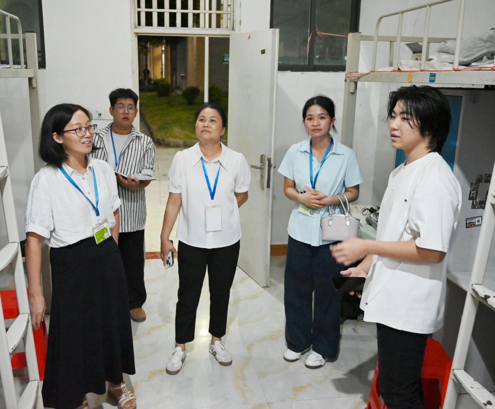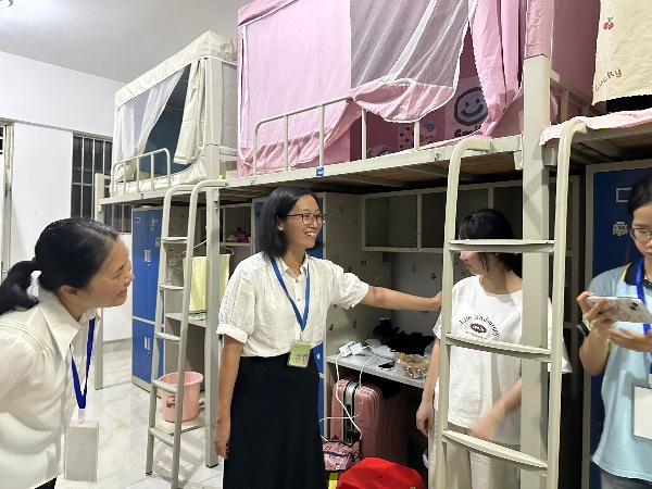 當(dāng)晚 21 點(diǎn),學(xué)校校長助理梁善雅率領(lǐng)藝術(shù)設(shè)計(jì)學(xué)院教師們一行輕步走進(jìn)新生宿舍園區(qū)。每到一間宿舍,領(lǐng)導(dǎo)們都面帶微笑,與新生們親切交談,詳細(xì)詢問他們來自哪里、是否習(xí)慣宿舍的居住環(huán)境、飲食條件是否適應(yīng),以及開學(xué)報(bào)到以來遇到的困難和問題。“從家鄉(xiāng)到學(xué)校,路上還順利嗎?”“宿舍的熱水供應(yīng)、空調(diào)使用還方便嗎?”“如果生活上有任何需求,一定要及時(shí)跟輔導(dǎo)員或宿管員說。” 一句句關(guān)切的問候,一個(gè)個(gè)溫暖的舉動(dòng),瞬間拉近了與新生之間的距離,讓初入校園的新生們感受到了家一般的溫馨。