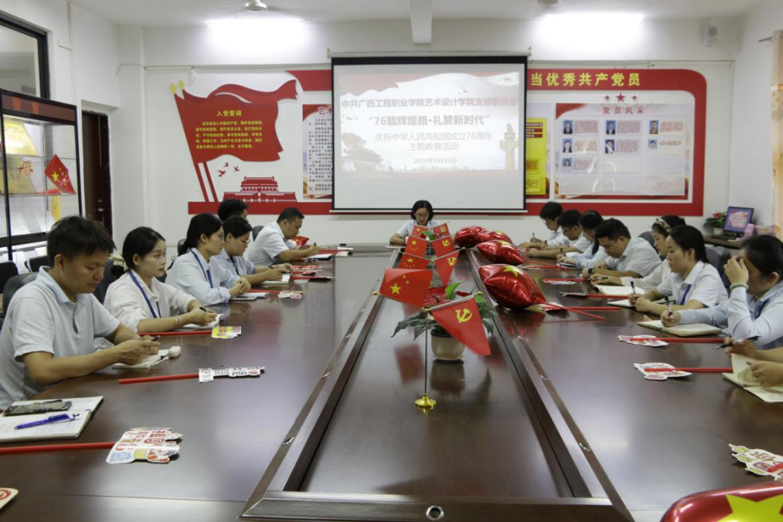 2025年9月30日下午,藝術設計學院黨支部在學院三樓黨員活動室開展了“76載輝煌路·禮贊新時代”慶祝中華人民共和國成立76周年主題教育活動。學院全體教師參加本次主題教育活動,活動由黨支部書記覃鳳姣同志主持,本次會議包含黨支部書記講黨課、老黨員給新黨員佩戴黨員徽章、黨支部書記領誓、同唱紅歌等四個環(huán)節(jié)。