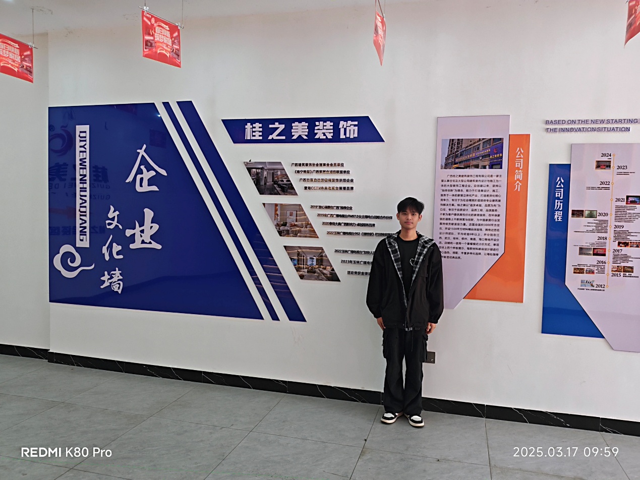 鐘偉右,共青團(tuán)員,2025屆藝術(shù)設(shè)計(jì)學(xué)院建筑室內(nèi)設(shè)計(jì)畢業(yè)生,現(xiàn)就職于廣西貴港市貴港桂之美建筑裝飾設(shè)計(jì)有限公司,崗位:設(shè)計(jì)師助理。