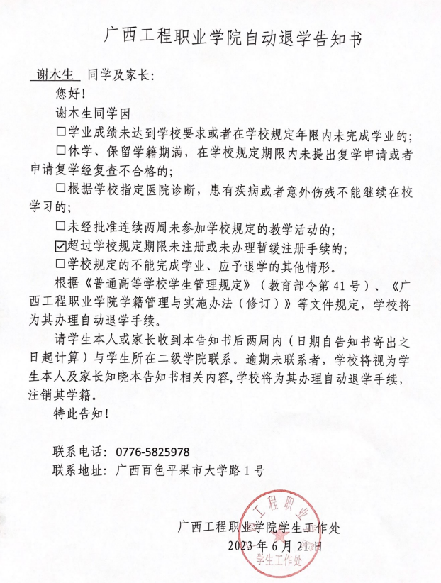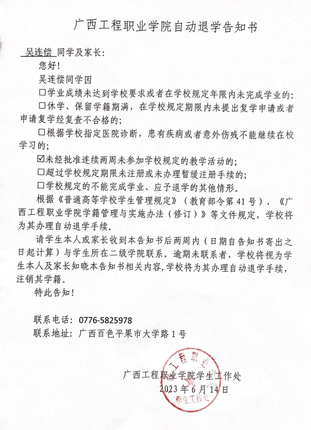 下一篇:廣西工程職業(yè)學(xué)院自動退學(xué)告知書/藝術(shù)設(shè)計學(xué)院
