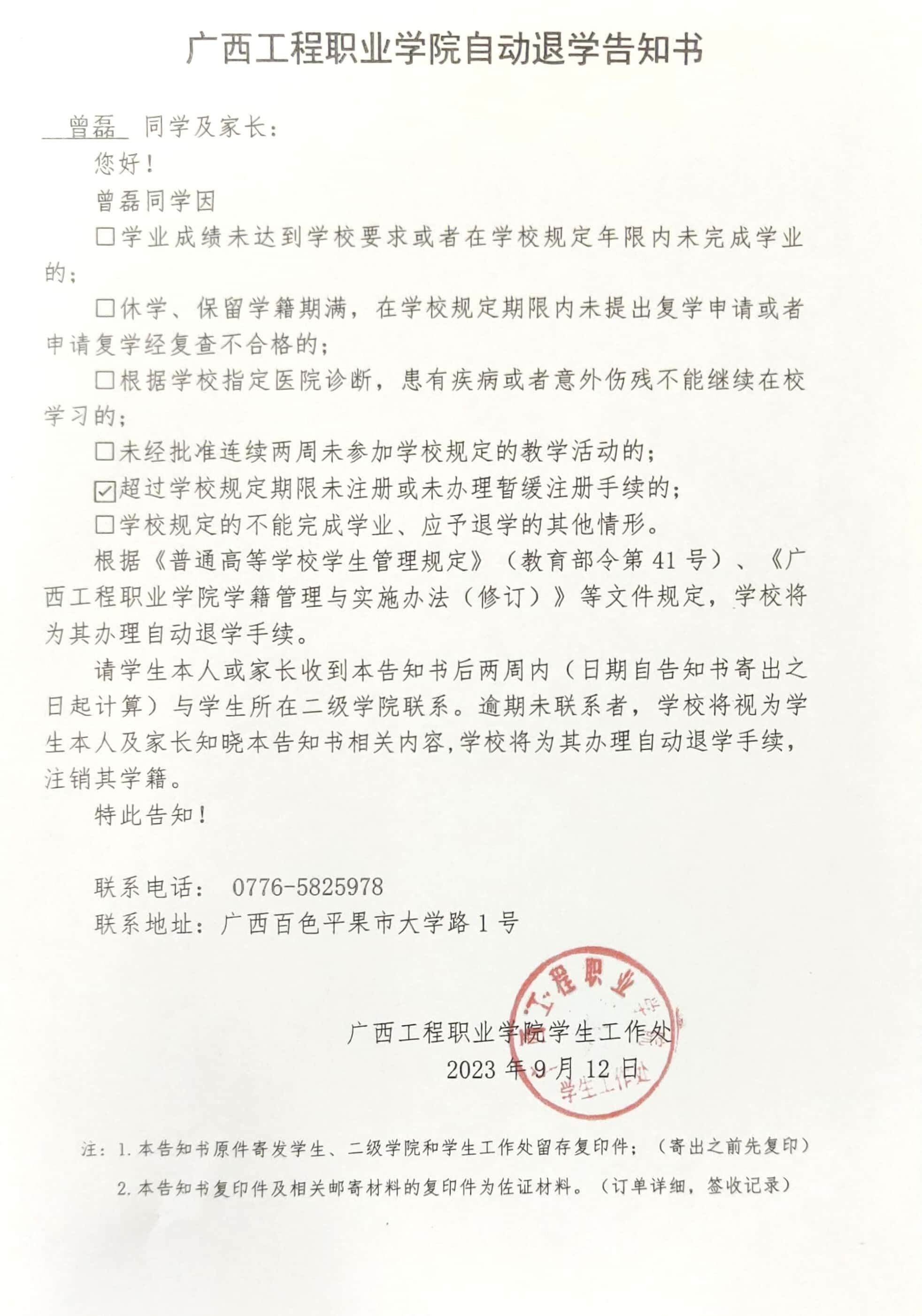 曾磊自動(dòng)退學(xué)告知書(shū)