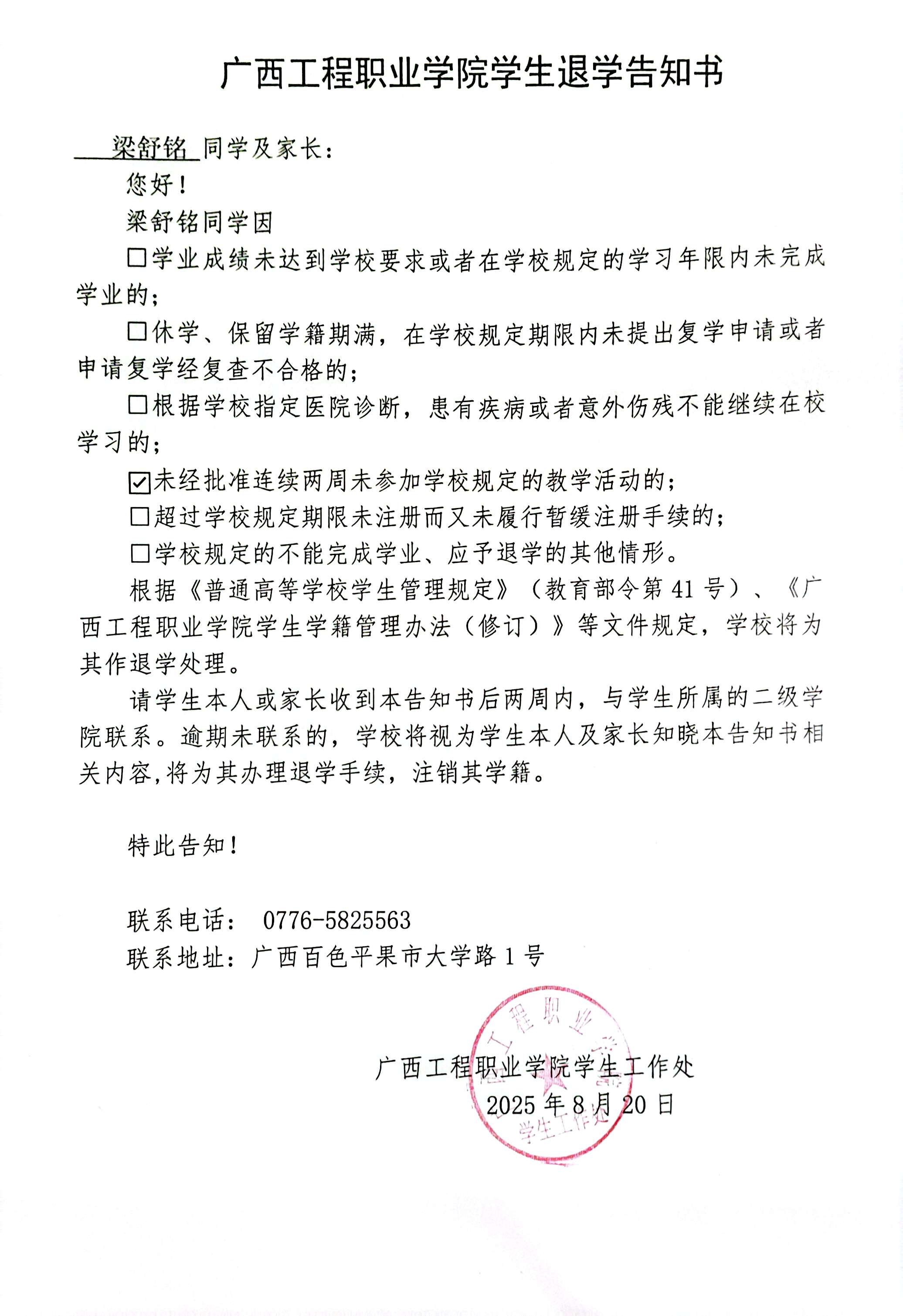 梁舒銘,男,學(xué)號(hào):202266060018,藝術(shù)設(shè)計(jì)學(xué)院2023級(jí)建筑室內(nèi)設(shè)計(jì)3班學(xué)生;該生于2025年8月4日返校,2025年8月7日離校,未經(jīng)批準(zhǔn)連續(xù)兩周未參加學(xué)校規(guī)定的教學(xué)活動(dòng),對(duì)老師的提醒亦不回復(fù),經(jīng)多次聯(lián)系學(xué)生本人及其家長(zhǎng)均無(wú)果。學(xué)校于2025年8月21日郵寄退學(xué)告知書(shū),因不是學(xué)生本人及其家人簽收,處理告知書(shū)無(wú)法以直接送達(dá)、留置方式、郵寄方式送達(dá)本人。根據(jù)《普通高等學(xué)校學(xué)生管理規(guī)定》(教育部令第41號(hào))、《廣西工程職業(yè)學(xué)院學(xué)生學(xué)籍管理辦法(修訂)》規(guī)定,現(xiàn)通過(guò)廣西工程職業(yè)學(xué)院藝術(shù)設(shè)計(jì)學(xué)院官網(wǎng)予以公告,公告時(shí)間為2025年9月11日至2025年10月11日,公告期滿,即視為送達(dá)。