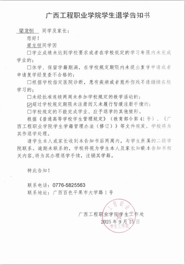 梁龍恒,男,學(xué)號(hào):202466010038,藝術(shù)設(shè)計(jì)學(xué)院2024級(jí)建筑室內(nèi)設(shè)計(jì)1班學(xué)生;于2025年8月31日開學(xué)至今未返校,超過學(xué)校規(guī)定期限未注冊而又未履行暫緩注冊手續(xù),對(duì)老師的提醒亦不回復(fù),經(jīng)多次聯(lián)系其本人及其家人均無果。學(xué)校于2025年9月16日郵寄退學(xué)告知書,因不是學(xué)生本人及其家人簽收,處理告知書無法以直接送達(dá)、留置方式、郵寄方式送達(dá)本人。根據(jù)《普通高等學(xué)校學(xué)生管理規(guī)定》(教育部令第41號(hào))、《廣西工程職業(yè)學(xué)院學(xué)生學(xué)籍管理辦法(修訂)》規(guī)定,現(xiàn)通過廣西工程職業(yè)學(xué)院藝術(shù)設(shè)計(jì)學(xué)院官網(wǎng)予以公告,公告時(shí)間為2025年9月30日至2025年10月29日,公告期滿,即視為送達(dá)。
