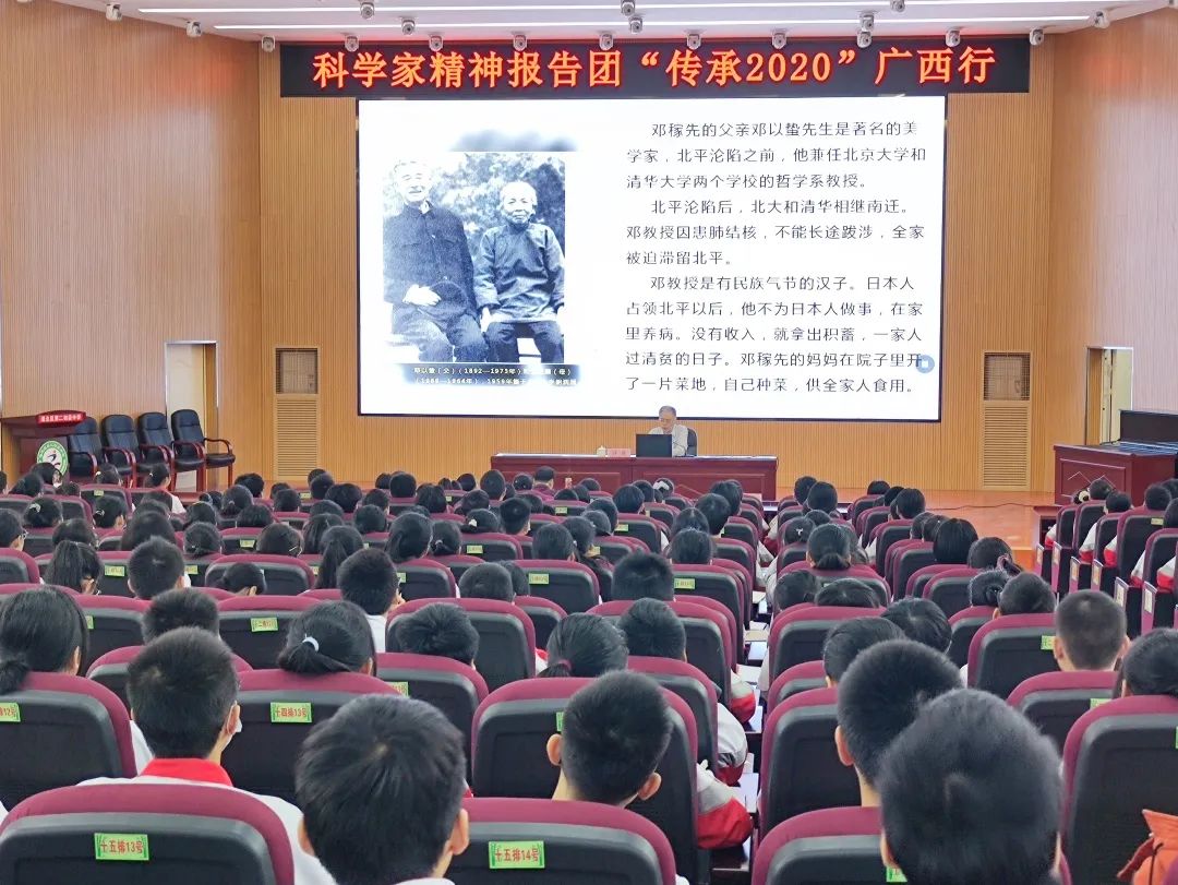 在河池學院和宜州區(qū)民族中學,黃緯祿之女黃道群從父親的童年說起,從另一個視角帶領同學們在偉大科學家的成長足跡中體悟獻身航天、忠誠報國的赤子情懷,在講述過程中,黃道群老師數(shù)次哽咽,臺下師生深受感動,用熱烈的掌聲向黃緯祿院士致敬;在河池市宜州區(qū)第二中學,朱光亞之子朱明遠通過“一次驚險的核試驗”“趕快回國去”“三進三出北大”等故事,與同學們共同緬懷“兩彈元勛”朱光亞的愛國情懷;在貴港市港北二中,鄧稼先妻侄許進深情講述了兩彈元勛鄧稼先為我國核武器事業(yè)做出的突出貢獻,讓大家了解鄧稼先辛勞的工作和平凡的生活,以及他波瀾壯闊、可歌可泣的一生……報告人精彩的講述,不僅贏得了在場師生雷鳴般的掌聲,還讓同學們接受了一次心靈的洗禮。