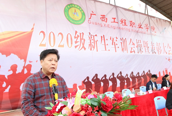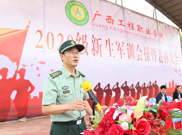 平果市大學(xué)園區(qū)黨工委書記、管理服務(wù)中心黨組書記楊敏捷講話,他首先對圓滿完成軍訓(xùn)任務(wù)的我校2020級學(xué)子表示祝賀,向長期以來支持我校國防教育工作的廣西三軍國防教育基地學(xué)生軍訓(xùn)教官表示感謝。