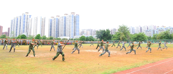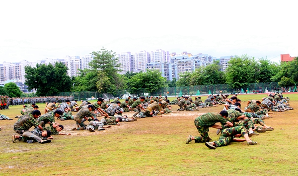緊接著,激動人心的棍術(shù)、擒敵拳、匕首操、手語操、作戰(zhàn)戰(zhàn)術(shù)等軍事訓(xùn)練項目在觀眾的期待中火熱上演,同學(xué)們矯健的身姿,高亢嘹亮的口號、整齊劃一的動作,充分展示了他們的意氣風發(fā)和壯志豪情,充分展現(xiàn)了他們經(jīng)過軍訓(xùn)洗禮后的喜人收獲與成果。