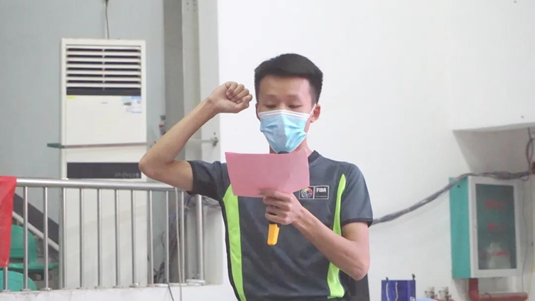 裁判員代表梁政進行宣誓,表示全體裁判員將堅守崗位,恪盡職守,公平裁決,嚴格履行裁判員職責,預祝本次“新生杯”籃球取得圓滿成功!