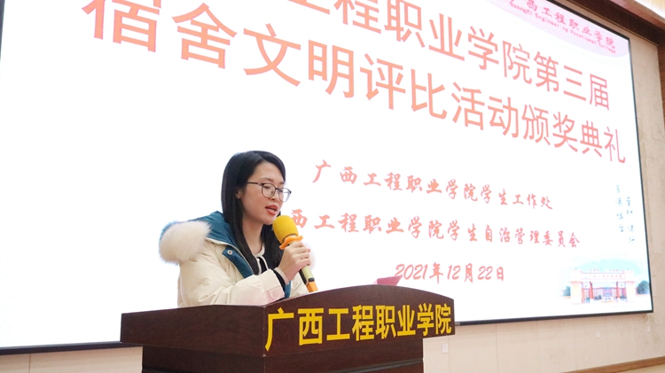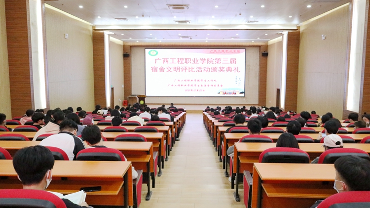 2021年12月22日晚,第三屆宿舍文明評比活動頒獎典禮在圖文信息樓一樓學(xué)術(shù)報告廳舉行,學(xué)校校長助理黃秋霞、覃清香,學(xué)生工作處副處長盧保日,各二級學(xué)院(部)負(fù)責(zé)人、分團(tuán)委書記等出席典禮,各二級學(xué)院輔導(dǎo)員以及學(xué)生代表參加頒獎典禮。