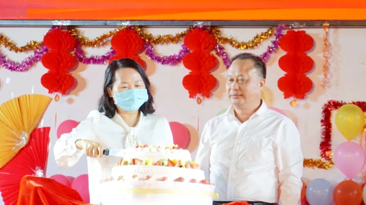 校領(lǐng)導(dǎo)代表切上15周年校慶蛋糕