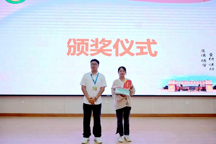 韋連飛老師為獲得三等獎(jiǎng)的張海燕同學(xué)頒獎(jiǎng)