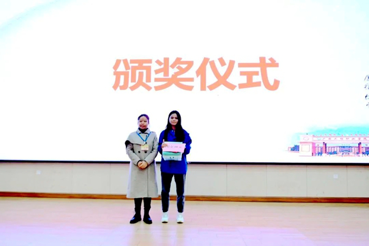 農(nóng)山老師為獲得二等獎(jiǎng)的譚玉梅同學(xué)頒獎(jiǎng)