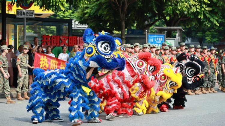靈動(dòng)的獅子在鑼鼓聲中跳躍、舞動(dòng)寓意著新兵們?cè)诓筷?duì)中能夠如龍似虎,勇往直前