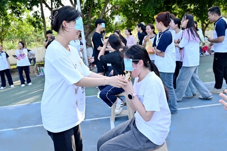 蒙眼吃香蕉的游戲吸引眾多人員參與,活動(dòng)區(qū)域早早便圍滿了躍躍欲試的師生。游戲規(guī)則簡潔而充滿懸念:參與者需蒙上眼罩,在隊(duì)友的語言指引下,找到指定位置的香蕉,完成剝皮并吃完,用時(shí)最短者獲勝。蒙眼吃香蕉項(xiàng)目不僅是一場趣味游戲,更是一次信任與默契的考驗(yàn)。指引者需要保持冷靜,用清晰準(zhǔn)確的語言為蒙眼的隊(duì)友指明方向;而挑戰(zhàn)者則要克服內(nèi)心的不安,完全信任隊(duì)友的指引。在這個(gè)過程中,每一次成功的配合都讓參與者感受到了團(tuán)隊(duì)的溫暖,每一次意外的狀況也都成為了歡樂的源泉。