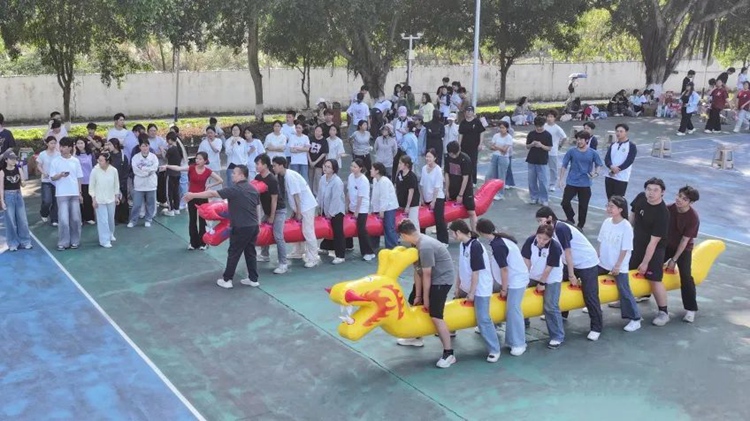 首先登場的是旱地龍舟項(xiàng)目。參賽隊(duì)員們兩兩并排,隊(duì)員跨坐龍舟兩側(cè),雙手提拉龍舟把手在特制的“龍舟”道具上,齊心協(xié)力喊著口號,步伐一致地向前邁進(jìn)。“一二一,一二一”,整齊有力的口號聲響徹籃球場?;顒?dòng)競爭激烈,大家都奮勇向前。有的小組配合默契,猶如離弦之箭飛速前進(jìn);有的小組在途中雖出現(xiàn)一些小狀況,但隊(duì)員們迅速調(diào)整狀態(tài),相互鼓勵(lì),不氣餒不放棄,堅(jiān)持完成比賽。該項(xiàng)目充分考驗(yàn)了團(tuán)隊(duì)的協(xié)作能力和默契程度,讓師生們深刻體會(huì)到團(tuán)結(jié)的力量,在比賽中不僅收獲了快樂,更收獲了團(tuán)隊(duì)的凝聚力。
