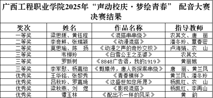 本次“聲動(dòng)校慶·夢(mèng)繪青春”配音大賽,為學(xué)生們提供了一個(gè)展示自我、鍛煉能力的平臺(tái)。這場(chǎng)視聽(tīng)盛宴不僅讓廣工程院學(xué)子在聚光燈下綻放個(gè)性光彩,更以聲音為媒介,編織出對(duì)學(xué)校十八載崢嶸歲月的深情禮贊,為校慶畫(huà)卷添上了充滿青春力量的絢麗注腳。