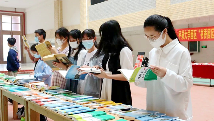 在圖文信息大樓一樓大廳,圖書館展出了紅色讀物、經(jīng)典文學(xué)作品、生態(tài)文明類書刊等,吸引眾多學(xué)生前來駐足觀看閱讀。同學(xué)們靜心閱讀,品味書香,營(yíng)造了濃厚的讀書氛圍。