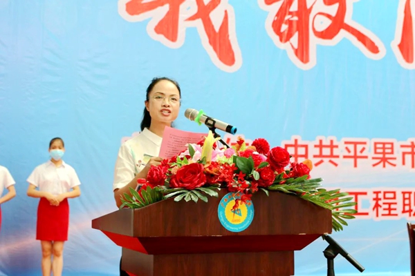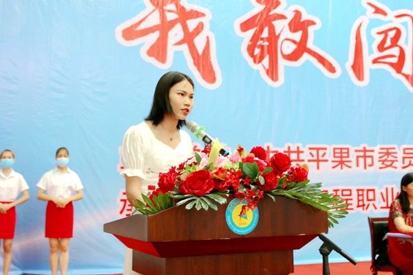 平果市大學(xué)園區(qū)黨工委專職書記黃華婷介紹近年來平果市大學(xué)園區(qū)創(chuàng)新創(chuàng)業(yè)情況 我校學(xué)生李燕婷同學(xué)發(fā)言。在去年的中國第五屆“互聯(lián)網(wǎng)+”大學(xué)生創(chuàng)新創(chuàng)業(yè)大賽上,李燕婷團(tuán)隊(duì)榮獲廣西區(qū)賽高校主賽道銅獎(jiǎng)的優(yōu)異成績, 她向同學(xué)們講述她成功創(chuàng)業(yè)的經(jīng)驗(yàn),呼吁同學(xué)們珍惜這次寶貴的比賽和學(xué)習(xí)鍛煉機(jī)會(huì),積極組隊(duì)報(bào)名參加比賽,在實(shí)踐中磨煉自身,在競技中不斷成長,在創(chuàng)新創(chuàng)業(yè)中譜寫更加壯美的青春華章。