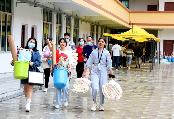 志愿者幫助新生領(lǐng)取生活用品并引領(lǐng)到學(xué)生宿舍