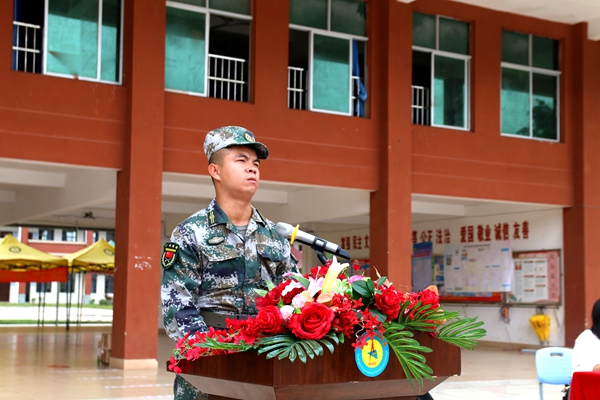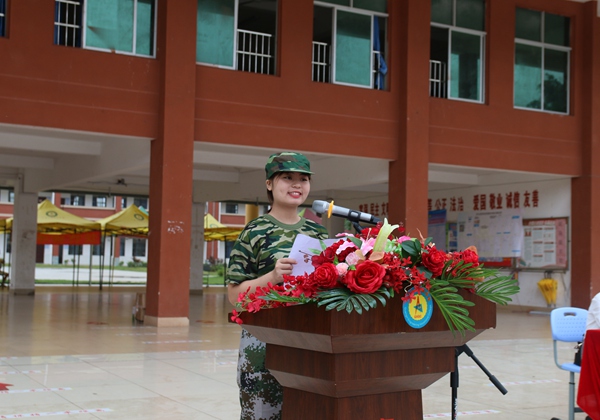 廣西三軍國防教育基地學生軍訓中隊教官講話,他對全體參訓學生提出要求,希望同學們能夠珍惜軍訓機會,多方面磨練自己,并把軍訓中的吃苦耐勞的精神融入今后的學習生活中。同時,表示全體教官將以高度負責的態(tài)度參與訓練,做好防疫,安全施訓,嚴格施訓,科學施訓,圓滿完成此次軍訓任務。