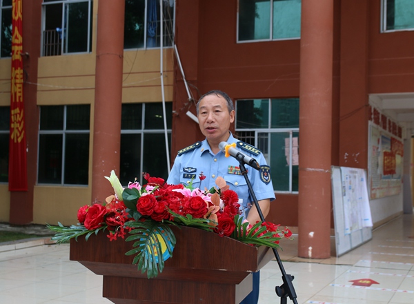 動員大會上,學校紀委書記李益為軍訓團授軍訓團團旗。