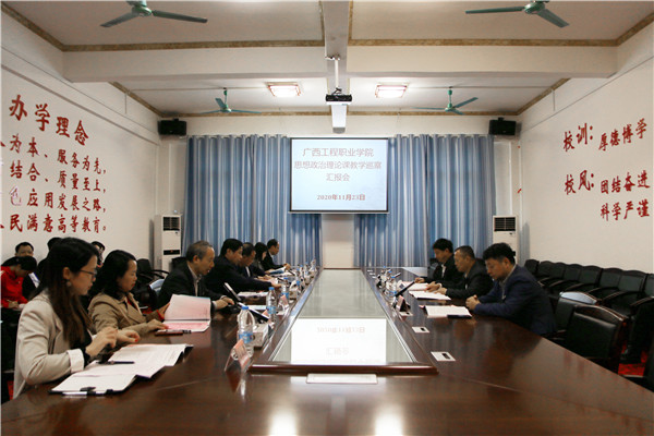 11月23日上午,廣西高校思想政治理論課教學巡察組專家在組長百色學院黨委副書記徐魁峰教授帶領(lǐng)下,桂林電子科技大學馬克思主義學院鄧國峰教授、廣西大學馬克思主義學院楊通進教授、百色學院馬克思主義學院院長韋順國教授一行4人,蒞臨廣西工程職業(yè)學院開展思想政治理論課教學工作巡察。
