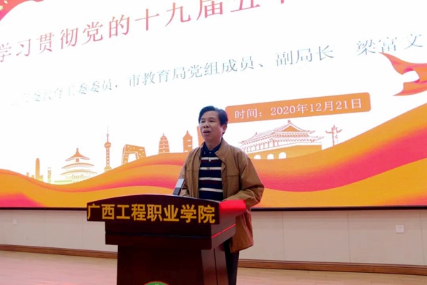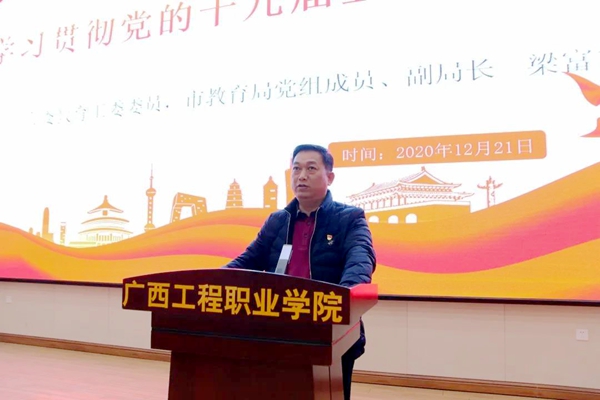 2020年12月21日下午,百色市委教育工委委員、市教育局黨組成員、副局長(zhǎng)梁富文在我校圖文信息大樓一樓學(xué)術(shù)報(bào)告廳為師生宣講學(xué)習(xí)貫徹黨的十九屆五中全會(huì)精神。學(xué)校黨委書(shū)記呂偉斌,學(xué)校副書(shū)記、副校長(zhǎng)胡細(xì)木,黨委委員、副校長(zhǎng)彭高彬,副校長(zhǎng)吳先夏、校長(zhǎng)助理黃秋霞等校級(jí)領(lǐng)導(dǎo)和師生共400多人參加出席宣講報(bào)告會(huì)。宣講報(bào)告會(huì)由黨委書(shū)記呂偉斌主持。