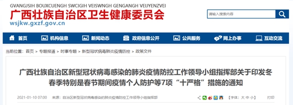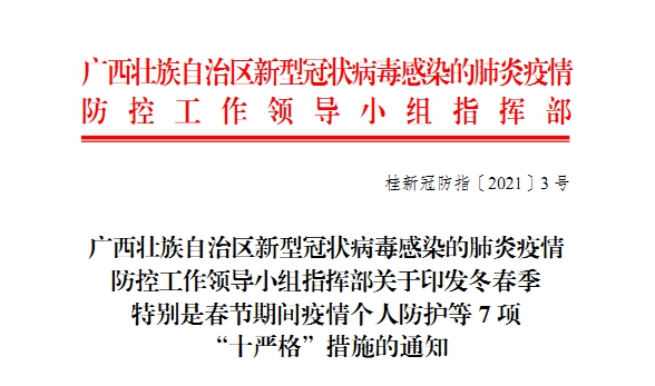近日,自治區(qū)新型冠狀病毒感染的肺炎疫情防控工作領(lǐng)導(dǎo)小組指揮部發(fā)布了關(guān)于印發(fā)冬春季特別是春節(jié)期間疫情個(gè)人防護(hù)等7項(xiàng)“十嚴(yán)格”措施的通知