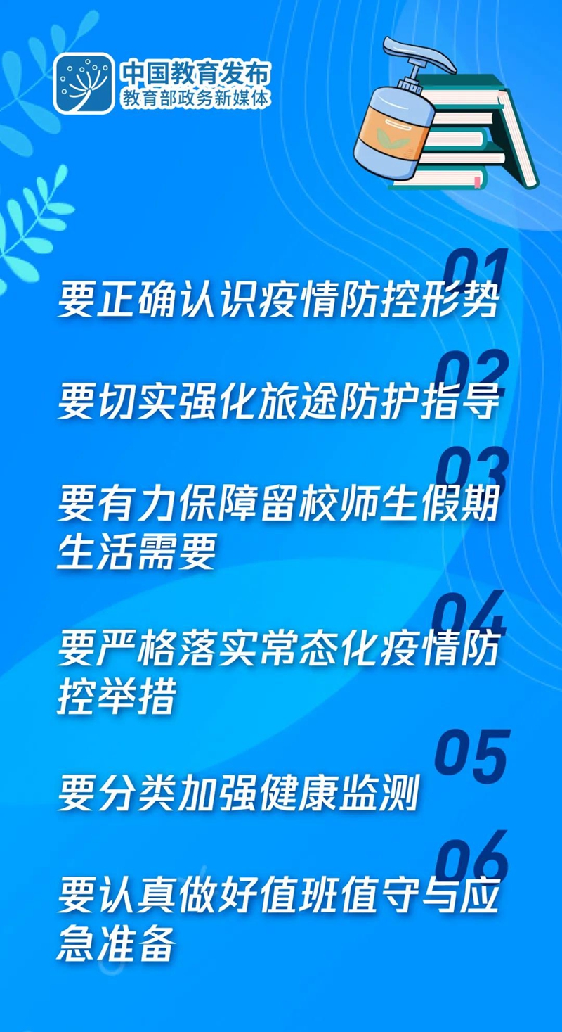 通知指出,要正確認(rèn)識疫情防控形勢。“五一”假期來臨,各地教育部門和學(xué)校要高度重視“五一”假期疫情防控,堅持常態(tài)化精準(zhǔn)防控和應(yīng)急處置相結(jié)合,鞏固拓展疫情防控成果,確保廣大師生安全快樂度假。