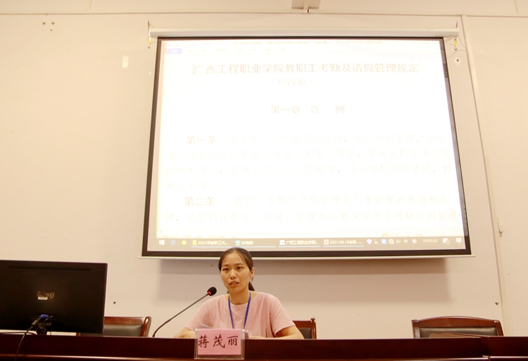 會(huì)上,教學(xué)督導(dǎo)室副主任韋永驍、人力資源處處長蔣茂麗分別對《廣西工程職業(yè)學(xué)院教學(xué)事故認(rèn)定及處理辦法》(修訂稿)、《廣西工程職業(yè)學(xué)院教職工考勤及請假管理規(guī)定》(修訂稿)進(jìn)行解讀和說明。