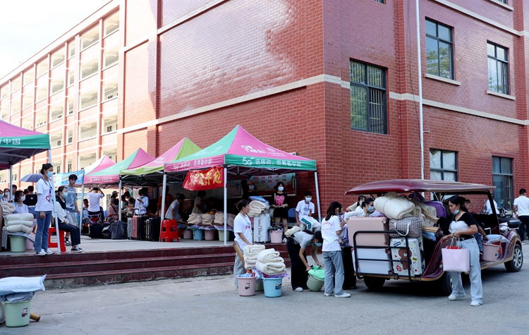 在校內(nèi),學(xué)校開通新生入學(xué)報到綠色通道,張貼入學(xué)報到流程,設(shè)置接待、引領(lǐng)、咨詢、行李寄存、各二級學(xué)院(部)注冊區(qū)、生活物品領(lǐng)取、校園觀光車送新生到宿舍等服務(wù)崗;同時,為進一步提高迎新工作效率、提升迎新工作質(zhì)量,學(xué)校還進一步優(yōu)化了迎新系統(tǒng),新生可在線上完成信息采集、繳費等一系列手續(xù),讓入學(xué)報到變得更為智能便捷。