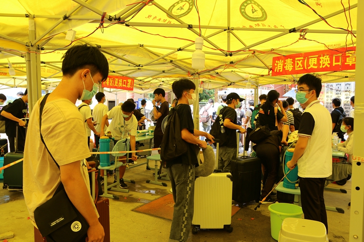 學(xué)校在校門口設(shè)置入校疫情防控核查通道,新生及其家長在志愿者的幫助下,進(jìn)行掃碼、測(cè)溫、身份驗(yàn)證、消殺隨身行李,順利通過疫情防控安全通道后,由迎新志愿者引領(lǐng)至教學(xué)樓各迎新點(diǎn)辦理報(bào)到注冊(cè)。我們的學(xué)長、學(xué)姐幫助新生提行李、指路,引領(lǐng)到各個(gè)報(bào)到點(diǎn)辦理手續(xù)、入住宿舍等,忙前忙后,服務(wù)周到、細(xì)致、熱情,贏得新生及其家長的好評(píng)。