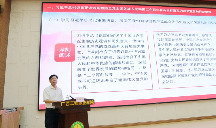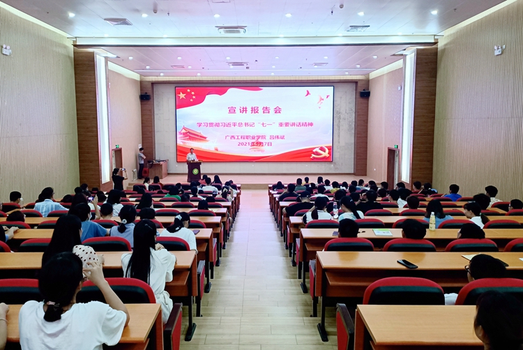 2021年9月7日下午,學(xué)校黨委在圖文信息大樓一樓學(xué)術(shù)報(bào)告廳舉行學(xué)習(xí)貫徹習(xí)近平總書記“七一”重要講話精神宣講報(bào)告會(huì),校黨委委員、副校長、宣傳部長彭高彬,校長助理黃秋霞,各黨支部書記、各部門負(fù)責(zé)人、全校師生黨員、教師代表、學(xué)生代表共300多人參加宣講報(bào)告會(huì)。宣講報(bào)告會(huì)由黨委辦公室副主任黃香琴主持,校黨委書記呂偉斌研究員作宣講報(bào)告。