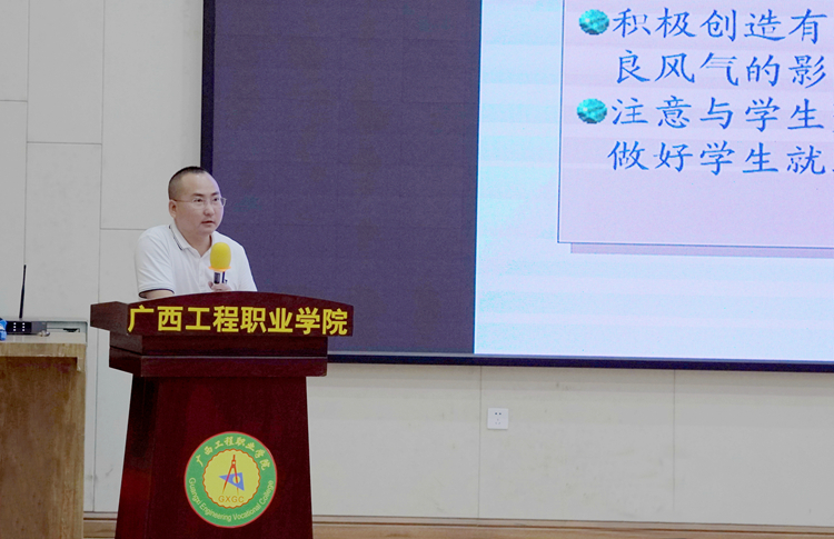 彭高彬副校長以“新形勢下高校師德師風(fēng)建設(shè)”為主題,從加強(qiáng)教師職業(yè)道德建設(shè)的重要意義、高校教師職業(yè)道德規(guī)范、廣西工程職業(yè)學(xué)院教師職業(yè)道德規(guī)范、新形勢下應(yīng)著重突出的師德內(nèi)涵等四個(gè)方面,結(jié)合自身的教育教學(xué)經(jīng)歷及師德規(guī)范典型事例,用幽默風(fēng)趣的語言,深入淺出地闡述了如何成為一名好教師。