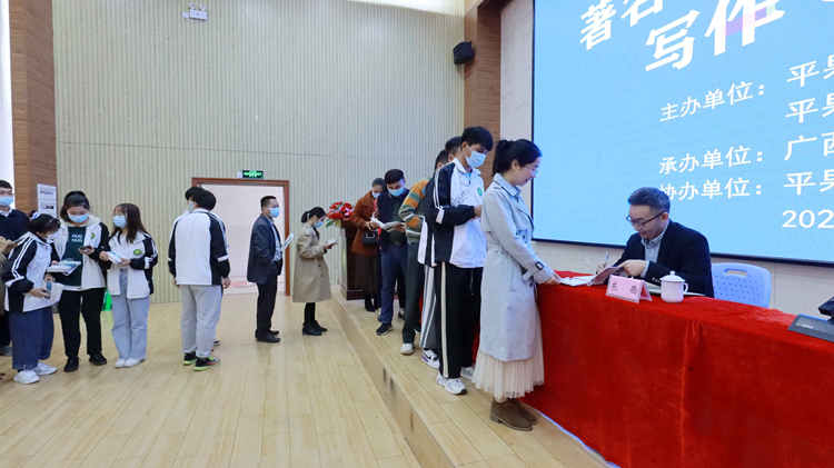 廣西文聯(lián)主席、廣西作家協(xié)會(huì)主席、廣西民族大學(xué)教授田代琳,百色市文聯(lián)主席莫維銘,平果市委常委、宣傳部部長陳丹,平果市文聯(lián)主席張洲,平果市教育黨工委專職副書記、教育局黨組成員,平果大學(xué)園區(qū)黨工委書記,管理服務(wù)中心黨組書記許安著以及學(xué)校紀(jì)委書記李益、副校長林萌出席講座。