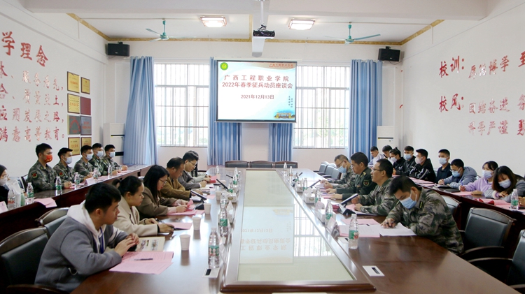 2022年春季征兵工作已經(jīng)開(kāi)始,為提高學(xué)校征兵工作參與人員的專(zhuān)業(yè)性和規(guī)范性,12月13日,廣西平果市人武部主要領(lǐng)導(dǎo)來(lái)廣西工程職業(yè)學(xué)院開(kāi)展征兵工作動(dòng)員。學(xué)校紀(jì)委書(shū)記李益、校長(zhǎng)助理黃秋霞,汽車(chē)與機(jī)電學(xué)院副院長(zhǎng)梁欣欣、國(guó)防科技學(xué)院副院長(zhǎng)李捷、學(xué)生工作處科長(zhǎng)范玉翠,各二級(jí)學(xué)院學(xué)生科科長(zhǎng)、輔導(dǎo)員代表和軍事協(xié)會(huì)學(xué)生代表參加了動(dòng)員座談會(huì)。