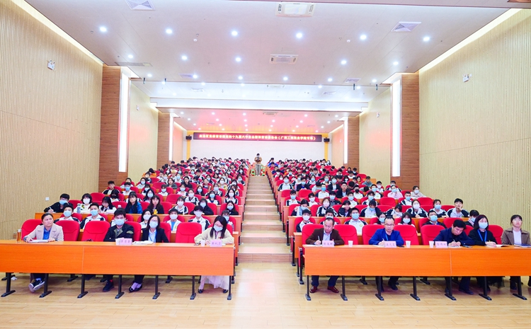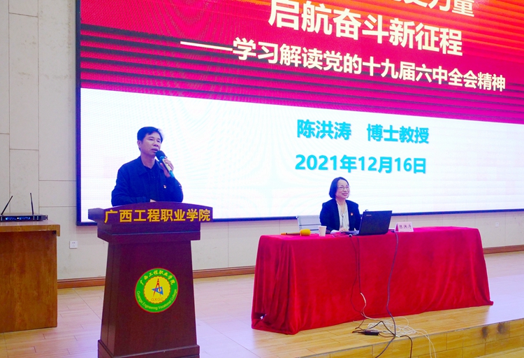 12月16日下午,在學(xué)校圖文信息大樓一樓學(xué)術(shù)報(bào)告廳,自治區(qū)黨委教育工委宣講團(tuán)成員陳洪濤教授作主題為“黨的十九屆六中全會(huì)精神”宣講報(bào)告。學(xué)校黨委書(shū)記呂偉斌,黨委委員、副校長(zhǎng)彭高彬,副校長(zhǎng)吳先夏,校長(zhǎng)助理黃秋霞、覃清香等領(lǐng)導(dǎo),各部門負(fù)責(zé)人、各黨(總)支部書(shū)記、師生黨員、學(xué)生代表等400多人參加報(bào)告會(huì)。報(bào)告會(huì)由呂偉斌主持。