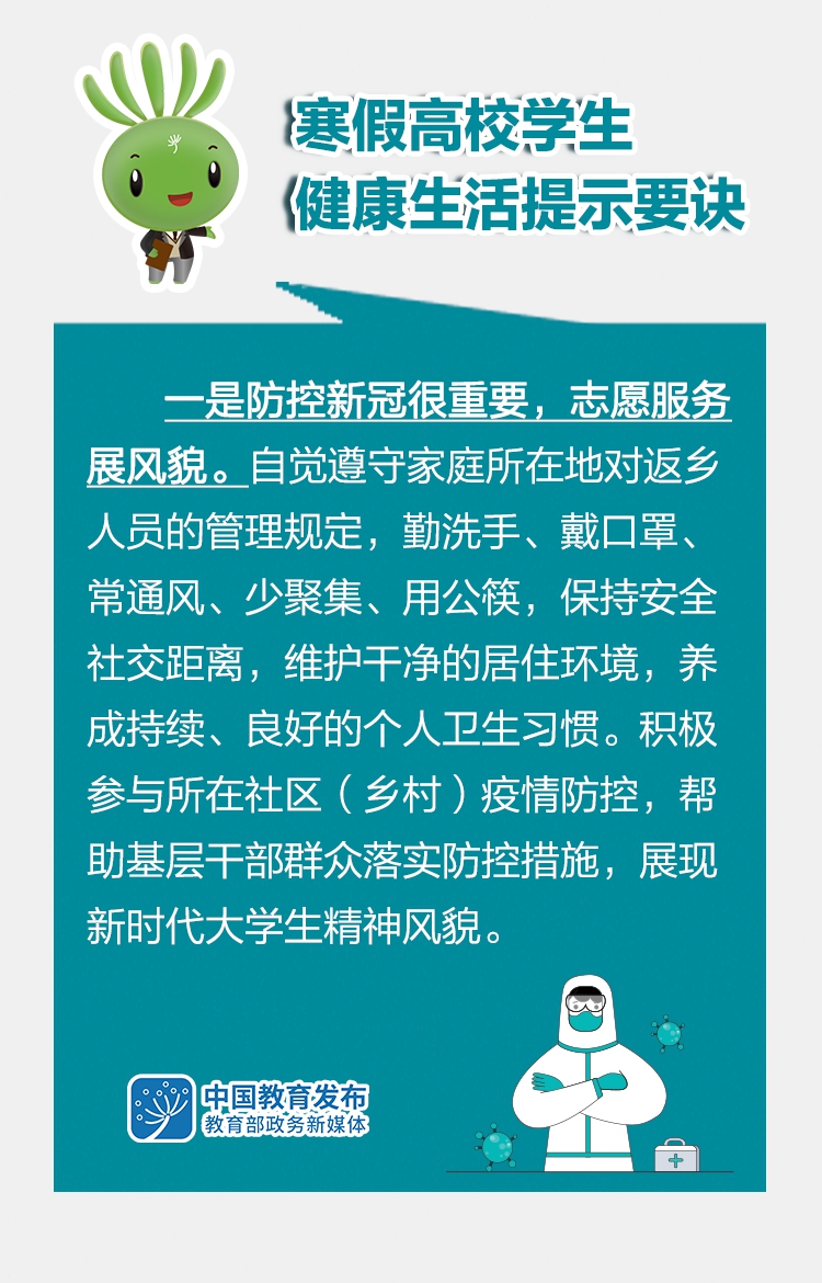 2022年寒假臨近,近日,教育部指導(dǎo)全國高校健康教育教學(xué)指導(dǎo)委員會專家,提出2022年寒假高校學(xué)生健康生活提示要訣,引導(dǎo)高校學(xué)生增強“健康第一責(zé)任人”意識,合理安排寒假生活和學(xué)習(xí),積極參與疫情防控,養(yǎng)成健康生活方式。