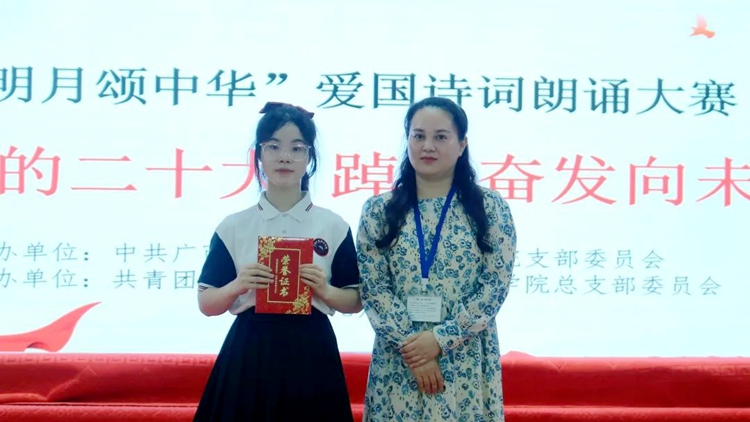 農(nóng)淑娟老師為獲得一等獎的選手頒獎