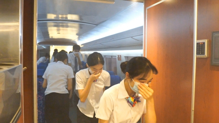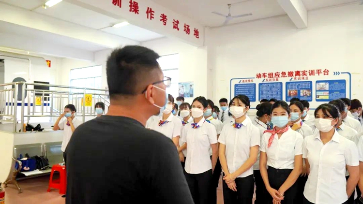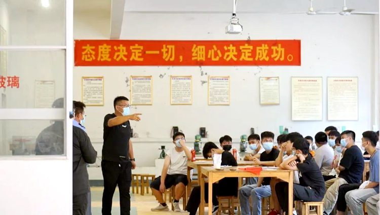 實(shí)驗(yàn)實(shí)訓(xùn)室濃煙滾滾,室內(nèi)煙霧報(bào)警器響起,同學(xué)們手持濕毛巾掩住口鼻,采取低姿勢迅速撤離實(shí)驗(yàn)實(shí)訓(xùn)室