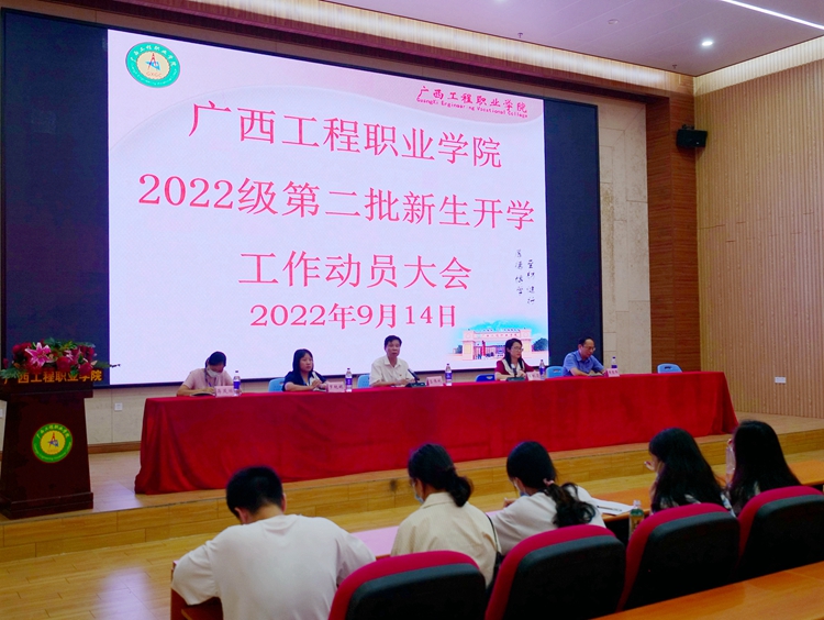 9月14日下午,廣西工程職業(yè)學(xué)院2022級第二批新生開學(xué)工作動員大會在圖文信息大樓報告廳舉行,學(xué)校黨委書記呂偉斌、副書記黃秋霞,副校長羅艷妮、黃德偉,校長助理蔣茂麗出席會議,全體教師參加會議。會議由校辦副主任班衛(wèi)麗主持。