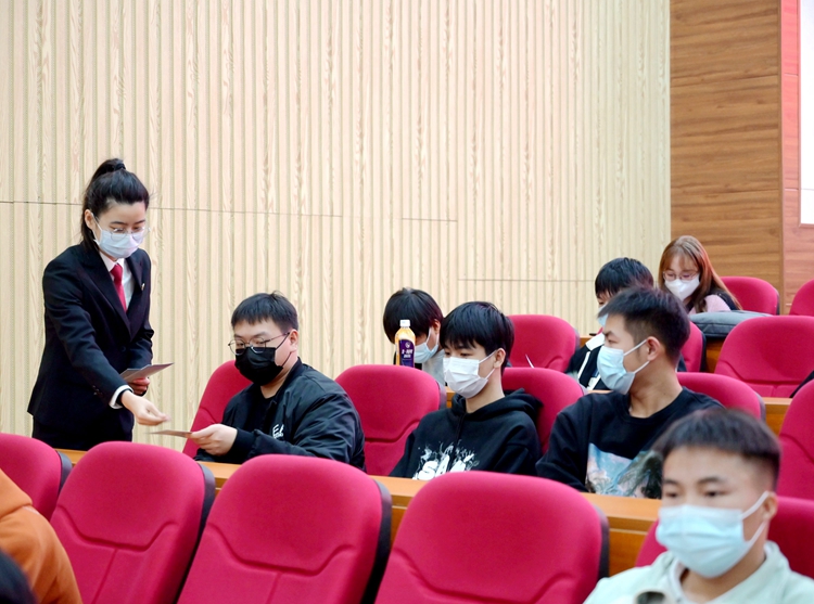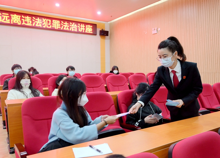 講座現(xiàn)場,法院干警向?qū)W生發(fā)放法治宣傳資料,讓學生們進一步學習法律知識。